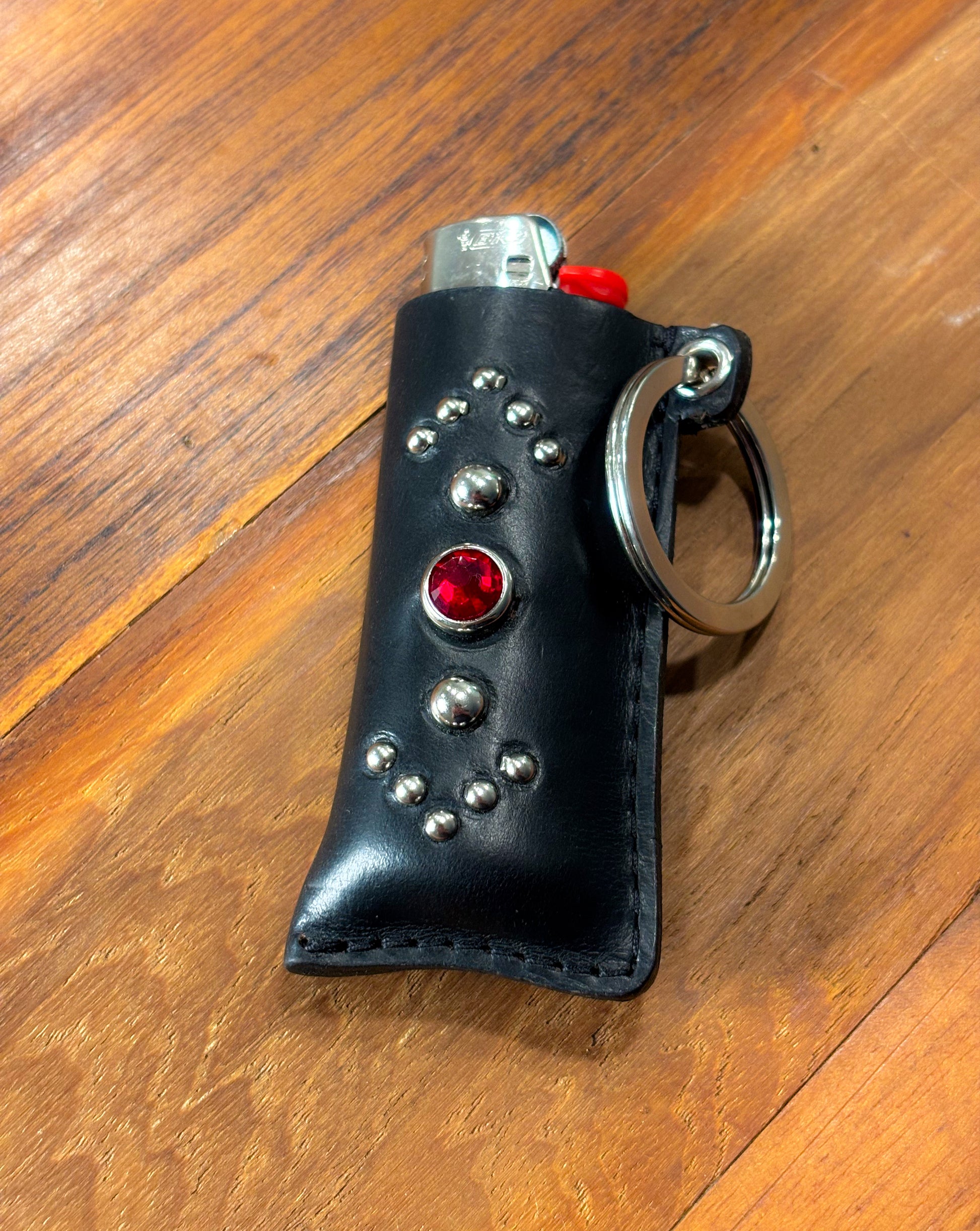 Introducing our Studded Leather Lighter Case made with world renowned leather Horween Chromexcel® iconic for its contribution to American heritage and workwear. Each lighter case is studded by hand with our classic arrow motif, a red Swarovski gem in the center, and a removable split keyring for easy hooking access!